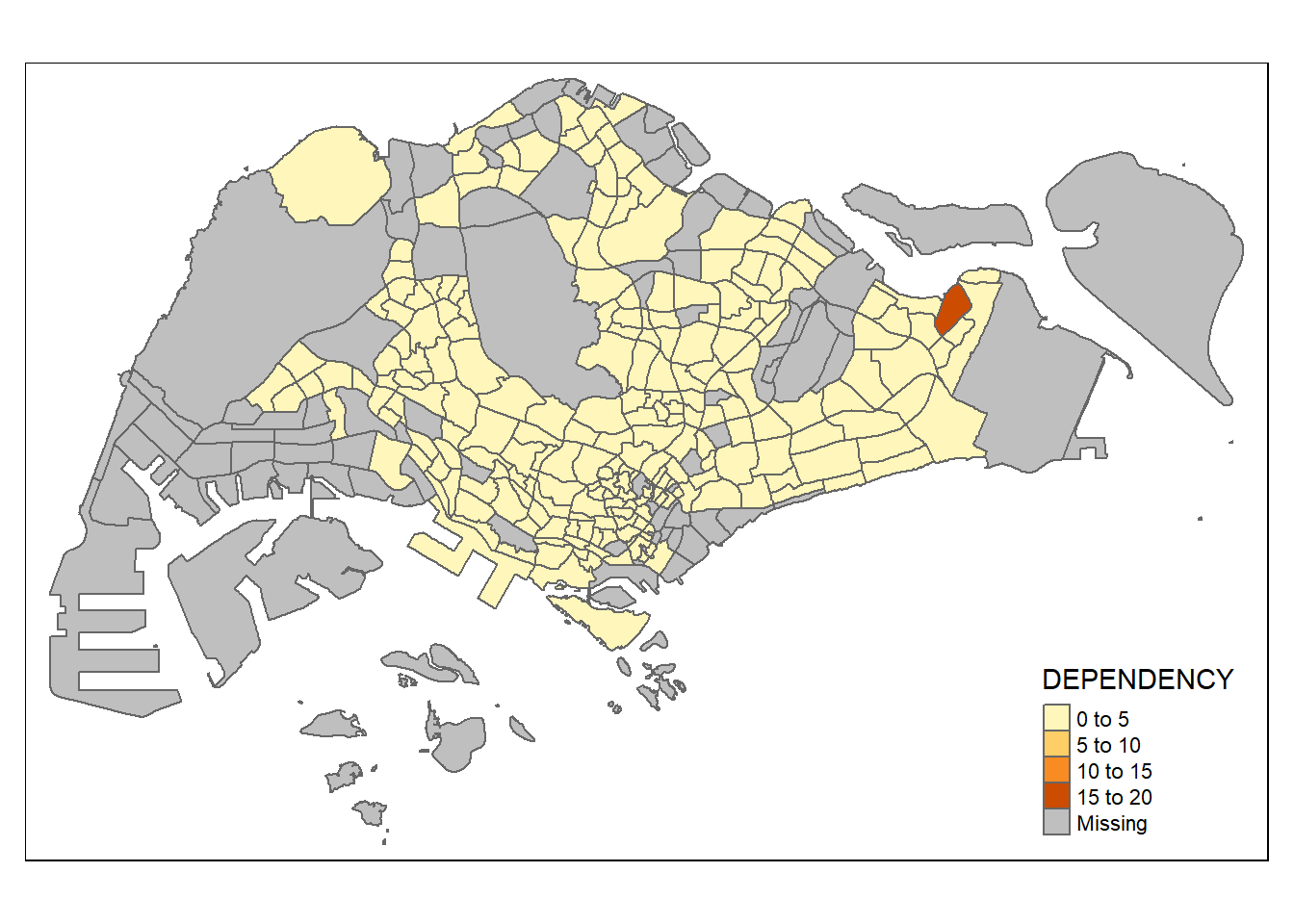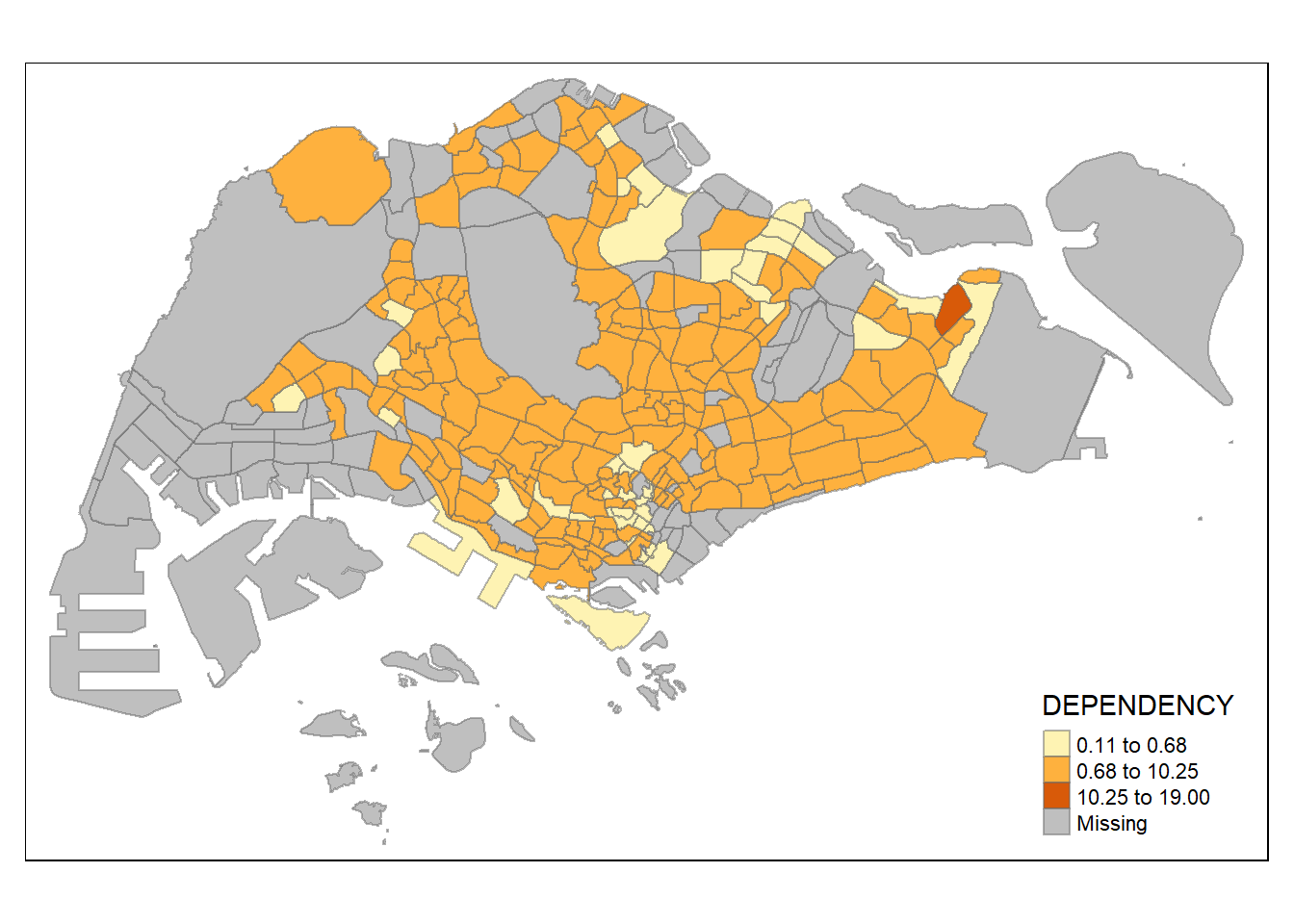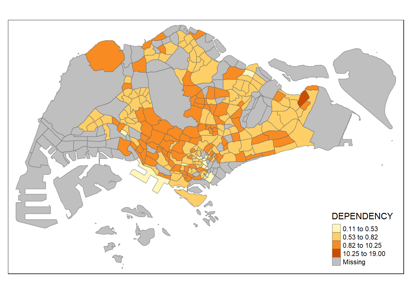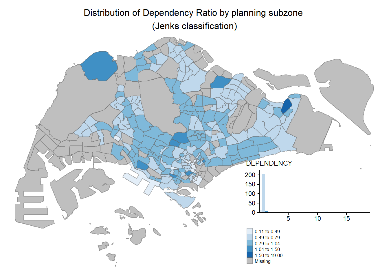 Before we get started, it is always a good practice to get some descriptive statistics on the variable before setting the break points. Code chunk below will be used to compute and display the descriptive statistics of DEPENDENCY field.