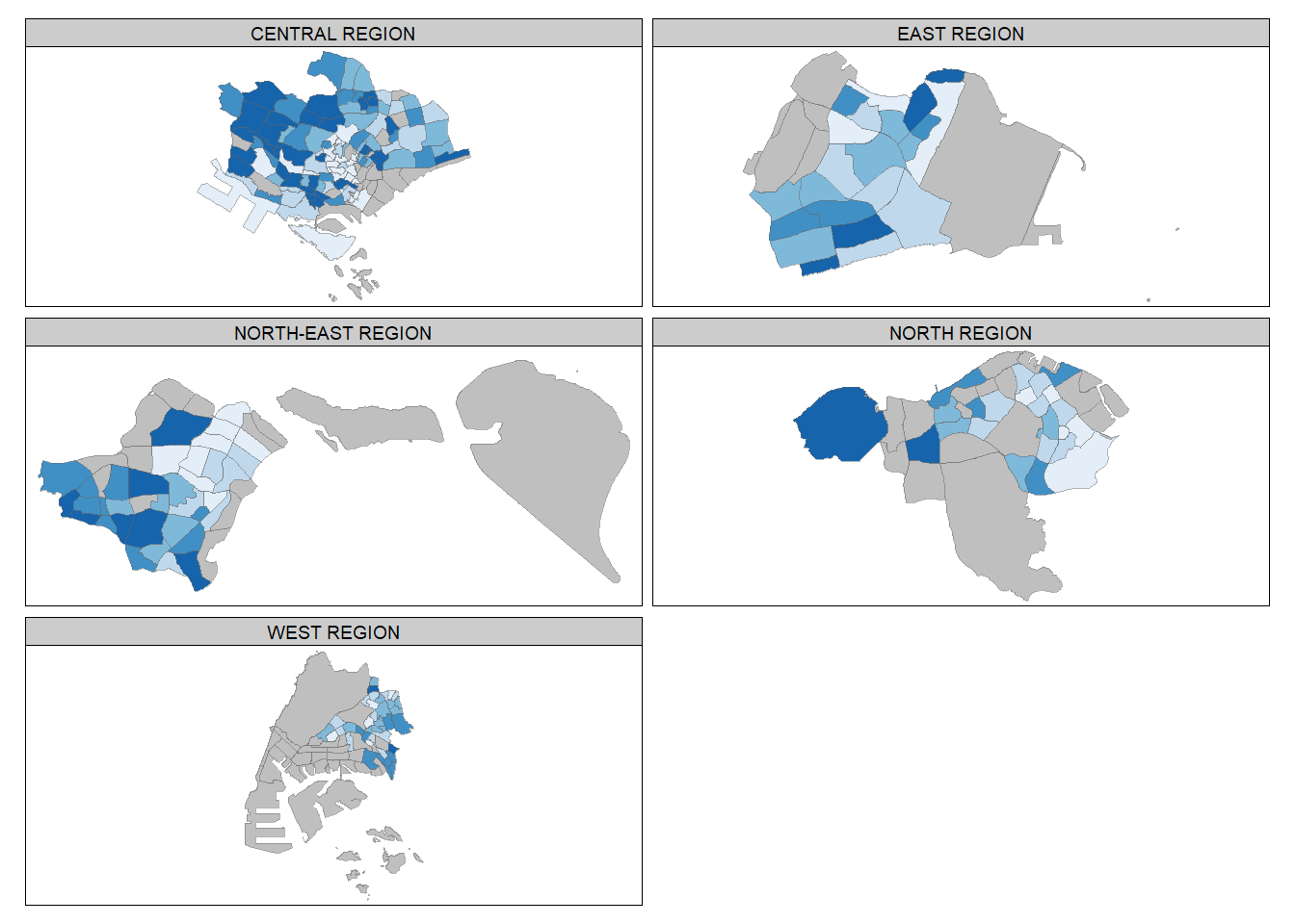 Instead of creating small multiple choropleth map, you can also use selection funtion to map spatial objects meeting the selection criterion.