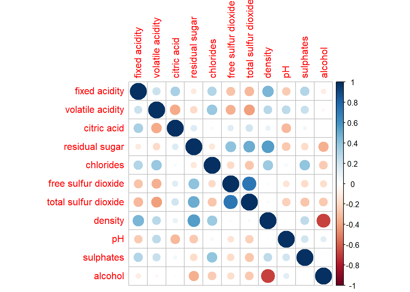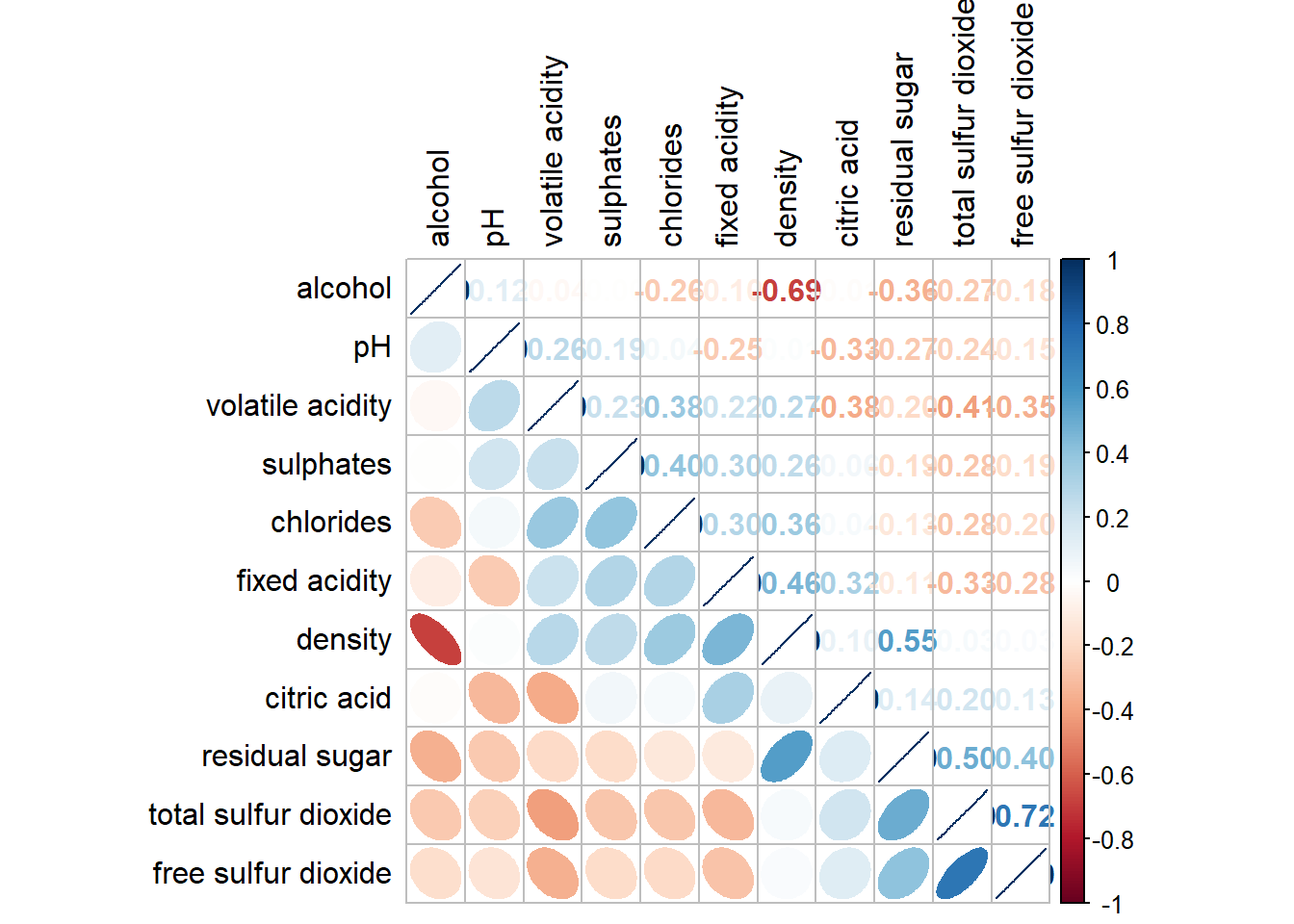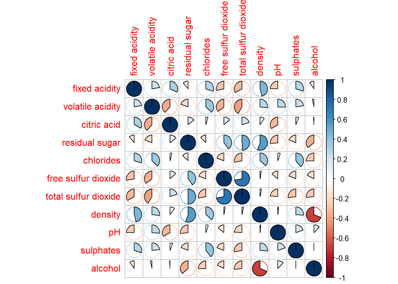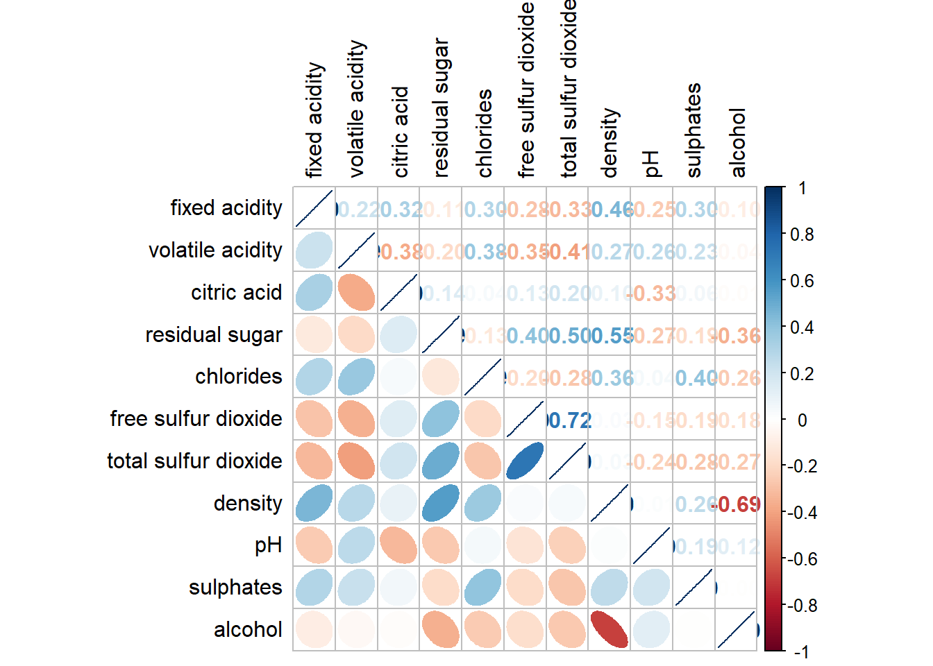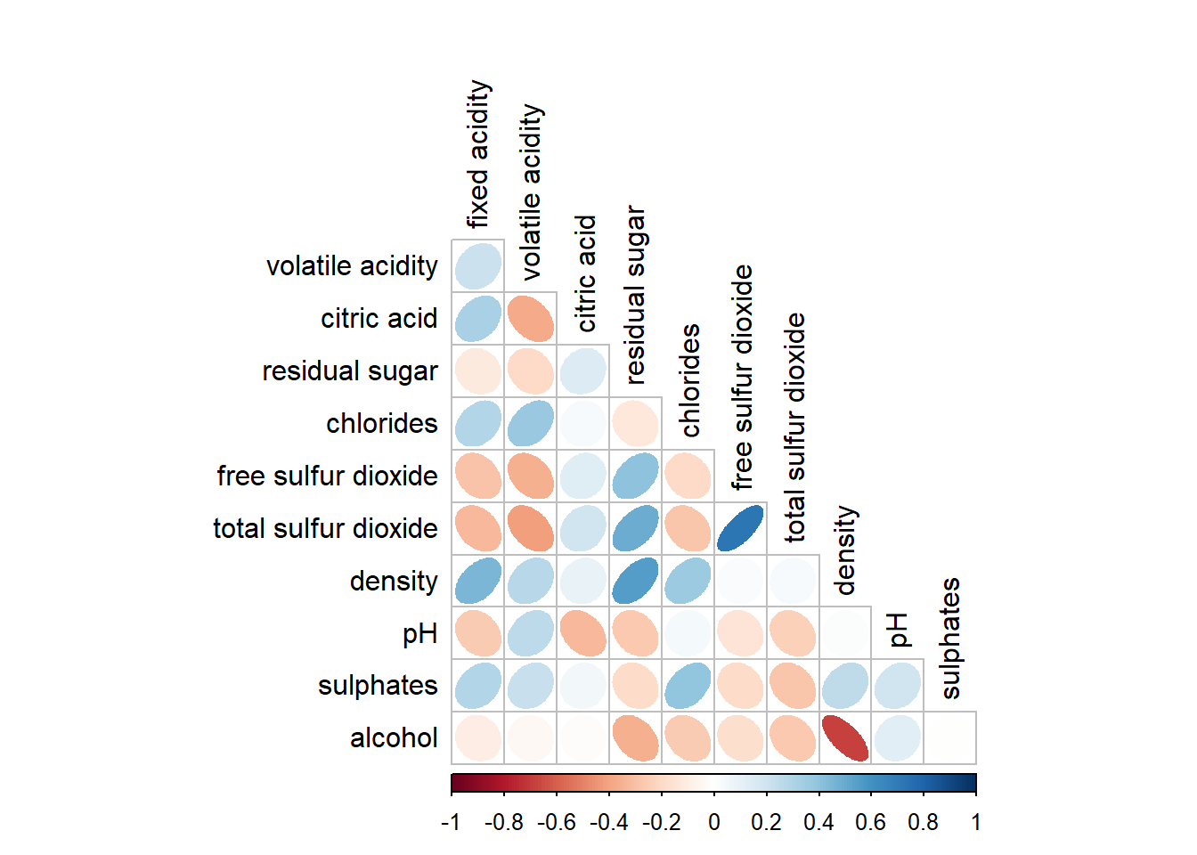 Figure below shows a corrgram combined with the significant test. The corrgram reveals that not all correlation pairs are statistically significant. For example the correlation between total sulfur dioxide and free surfur dioxide is statistically significant at significant level of 0.1 but not the pair between total sulfur dioxide and citric acid.