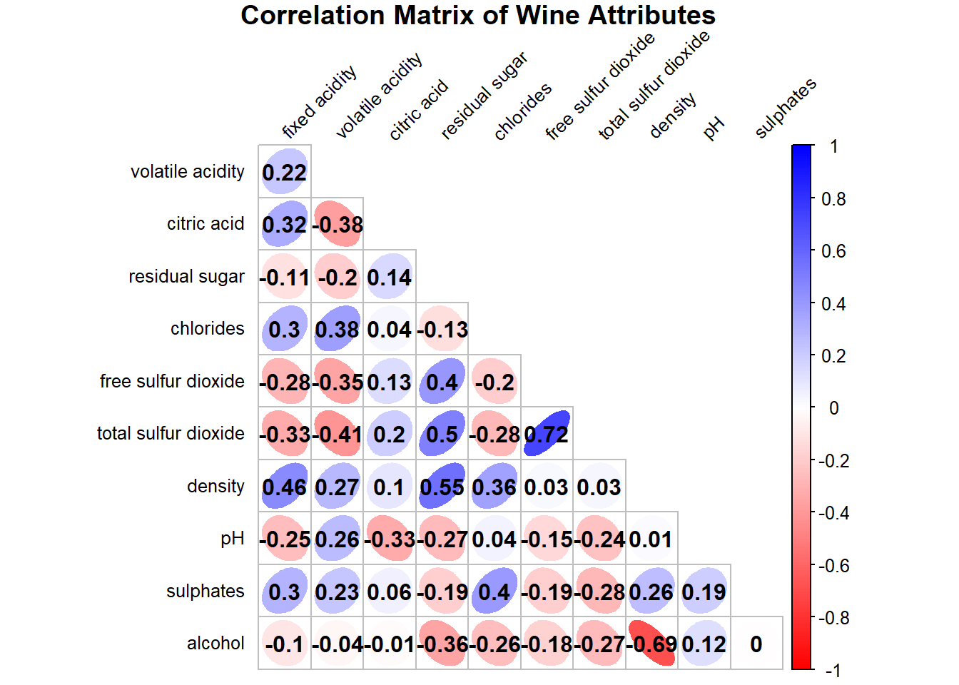 wine.cor <- cor(wine[, 1:11])Next, corrplot() is used to plot the corrgram by using all the default setting as shown in the code chunk below.